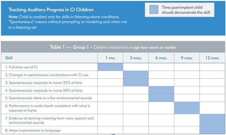 Before a school can provide an appropriate educational program, it must be established the level to which the child has made auditory progress since the time of implantation. With appropriate early intervention, including work with the family and child to develop auditory skills, the following progress is expected2: