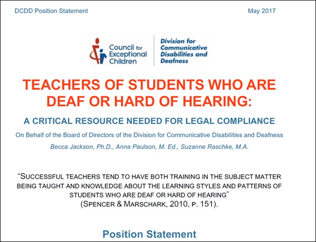 As employees, it is understood that we all want to comply with what our administrators require. Yet, very few professionals fully understand the impact of hearing loss and deafness on educational performance, and the components of supports and services that may be necessary for students to fully access and benefit from the general education curriculum.  The 2017 Division for Communicative Disabilities and Deafness Position Statement from the Council for Exceptional Children eloquently describes the role of the DHH professional as a critical resource needed for legal compliance. If you experience unusual resistance to your professional opinions about what is required for a student to receive FAPE, it is suggested that you share this Position Statement with your administrator, and if necessary, information about the two relevant court cases as a means to substantiate your important role in defining the appropriate individual educational program of students who are deaf or hard of hearing.