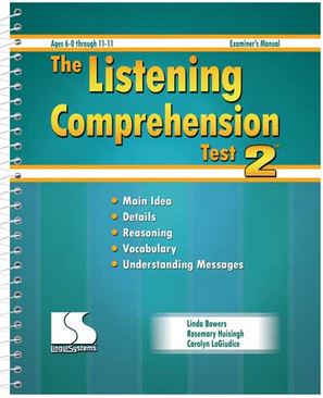 • Auditory Comprehension: Assesses ability to comprehend oral language at the sentence and narrative level, including literal recall, inference, and higher order language tasks such as idioms and figurative language